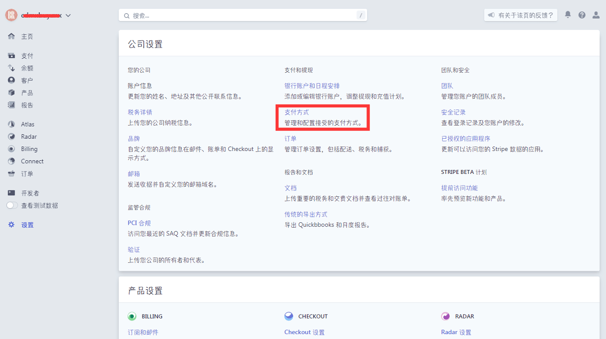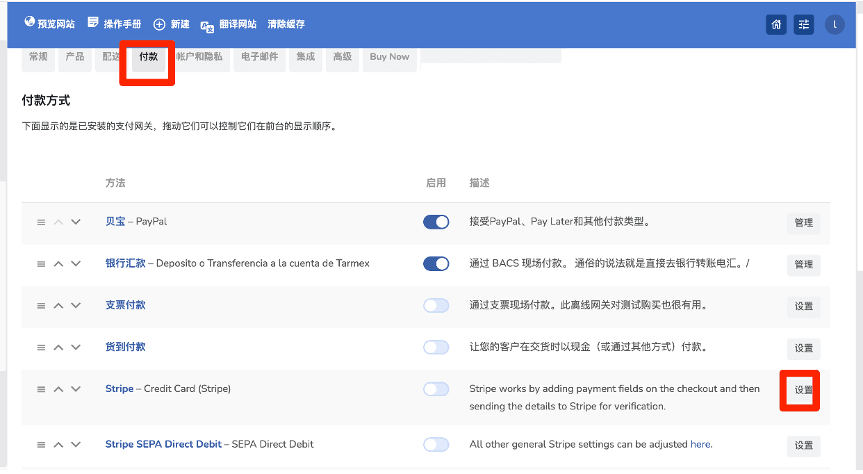 三、登录我们自建站的后台,点击商店管理—商店设置—付款—stripe(credit card)
