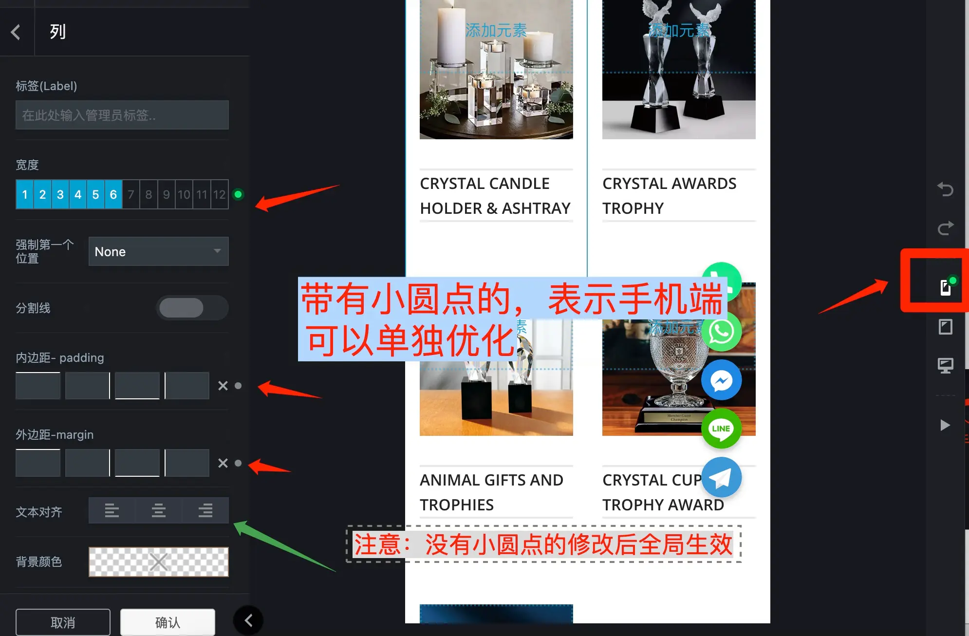 3、在任何元素(区段,图片、行、列等)上右键,选项中带有小圆点的均可以单独调节