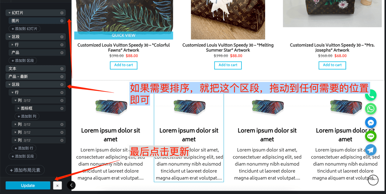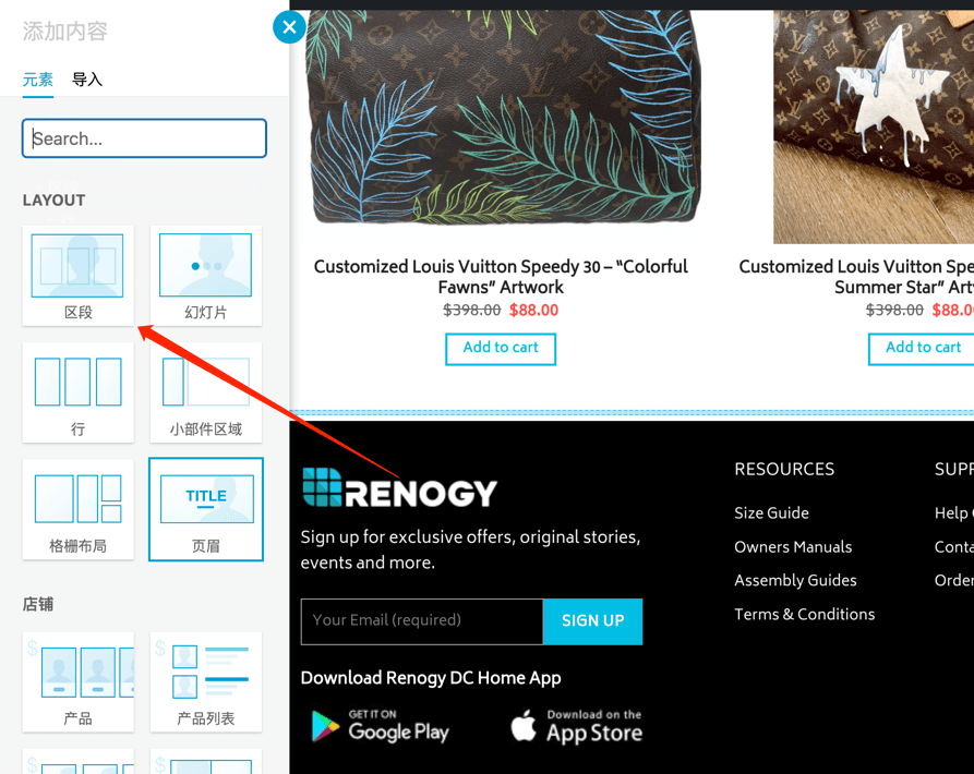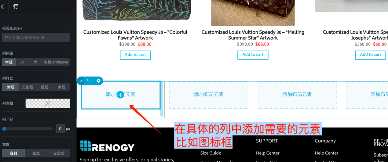 添加 行—列 (添加区段后如果在网站内容宽度中展示,就添加行),行是网页默认的宽度,比如1280或者1380的